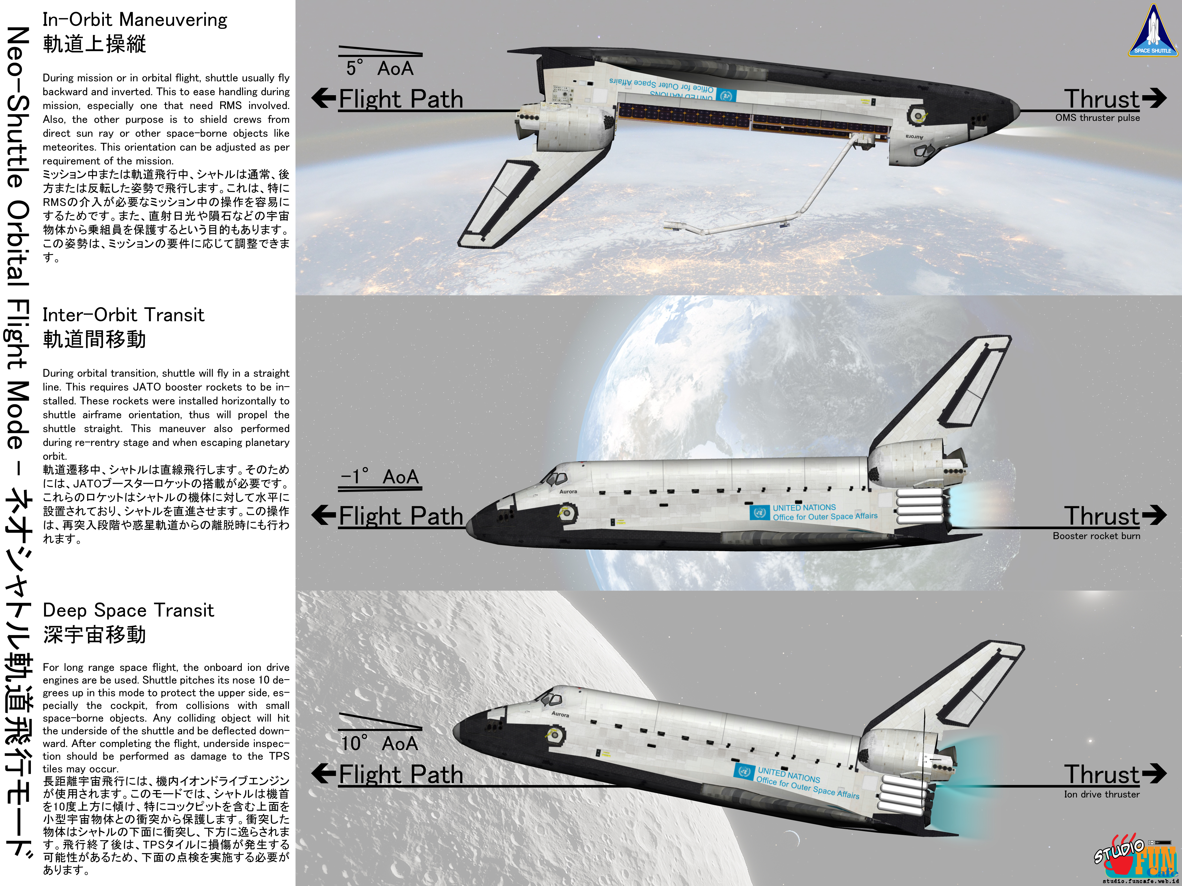 | Title: Neo-Shuttle Orbital Flight Mode Finished: October 09, 2025 Compared to the original space shuttle, the Neo-Shuttle capable to perform more missions than the original. With addition of plug-in rocket boosters, it can fly to higher orbit and even leaving Earth orbit. The installation of ion drive engines replacing the original RS-25 rocket engines makes Neo-shuttle can perform deep space flight like going to the moon. This illustrates the typical orbital flight profile of Neo-Shuttle according to the mission it performed. The atmospheric flight is not included in this illustration. |